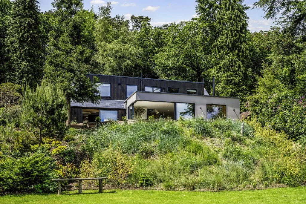• Modern house on a hillside surrounded by lush green trees and shrubbery with a grassy yard and a small bench in the foreground.