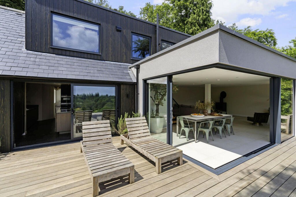 • Modern house with a large glass sliding door leading to a wooden deck. The deck has two wooden lounge chairs, a table with a potted tree, and a dining area with four chairs. The scene is surrounded by lush green lawn and trees.
