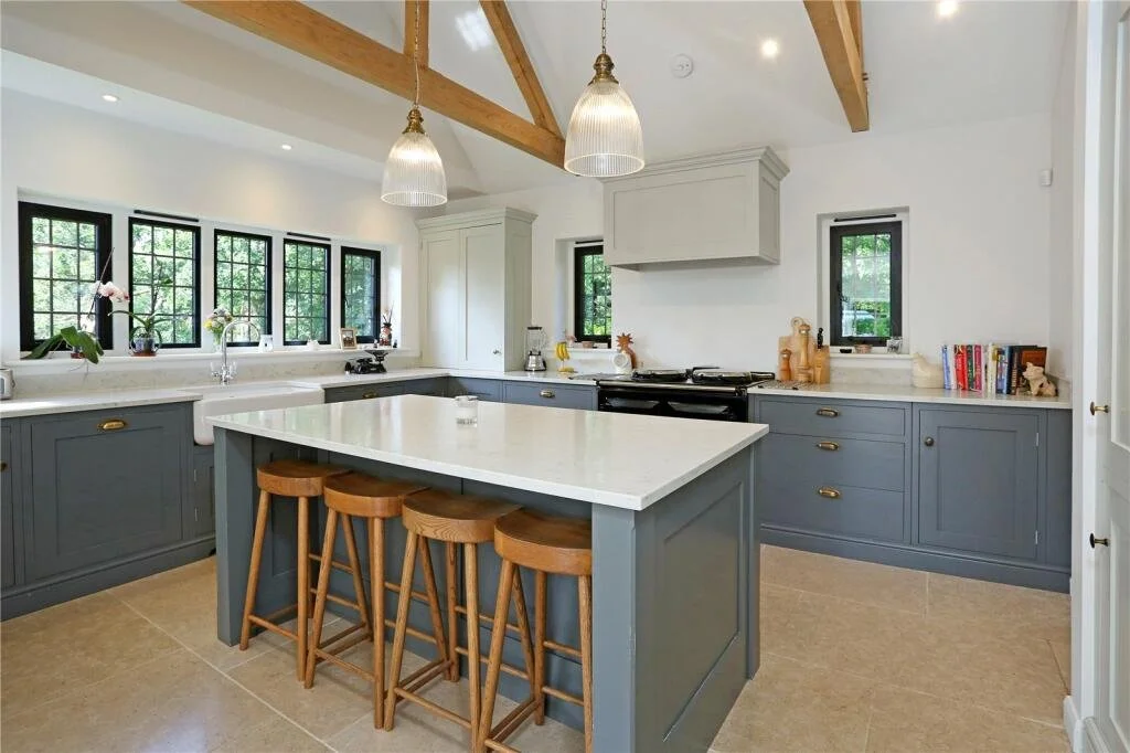 • Kitchen with blue lower cabinets, white upper cabinets, a central island with a white countertop, four wooden stools, black-framed windows, two hanging pendant lights, and beige tiled flooring.